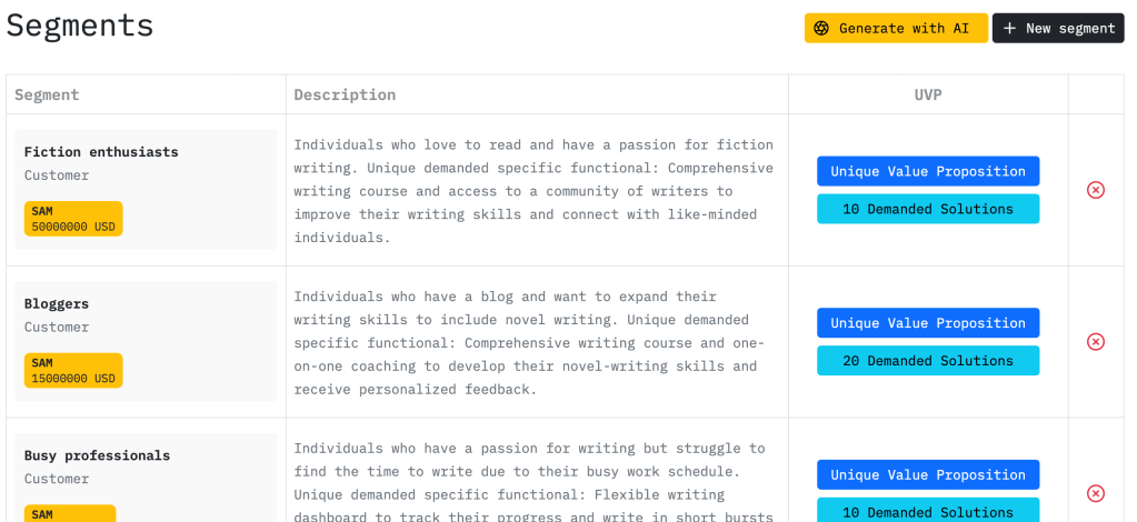 - Feature Functionality: Each feature, from segment analysis to competitor function analysis, is designed to give businesses a competitive edge. The product creates a detailed document with a Unique Value Proposition (UVP) for every target segment and a visual heatmap of competition for each segment.