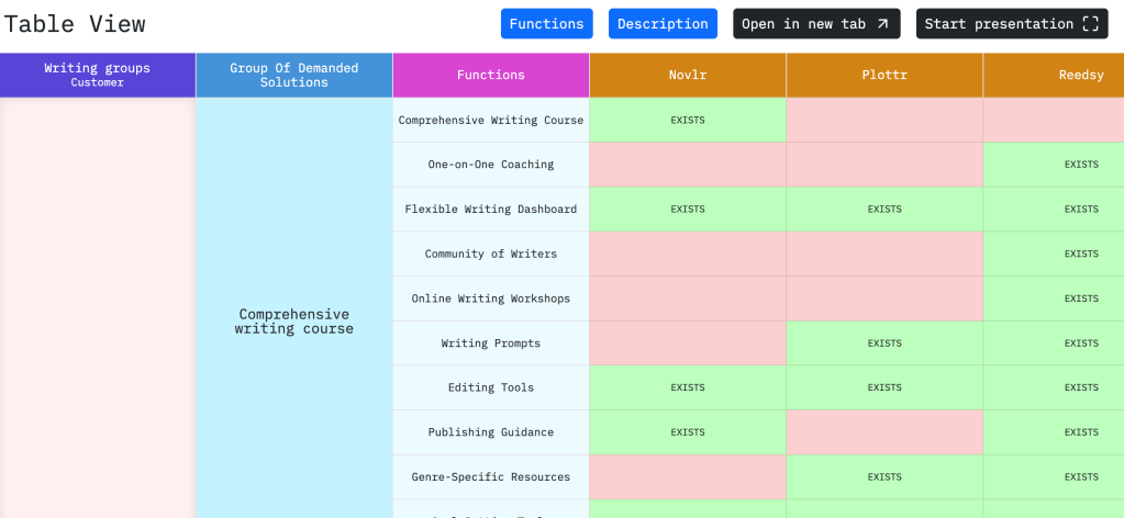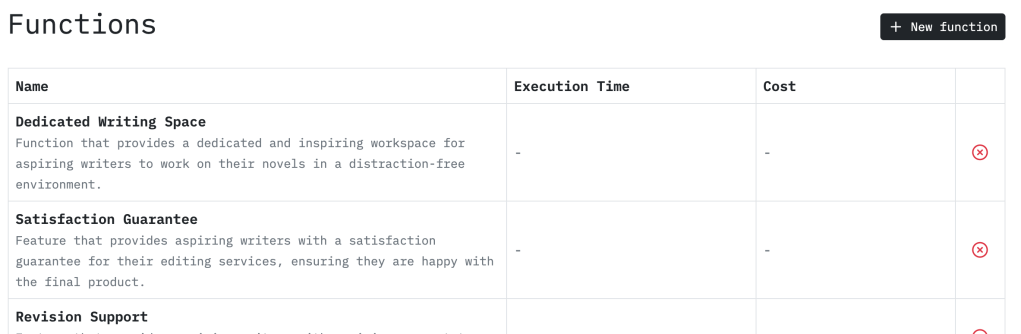 Functions are segments of solutions. You’ll get a comprehensive list of functions that will support every solution a customer has, with the option to understand the cost and time to build the feature. When I say comprehensive list this means exhaustive, its really long and some won’t be as tied to your product as you think (but they’re part of the bucket of features desired by your target audience(s))