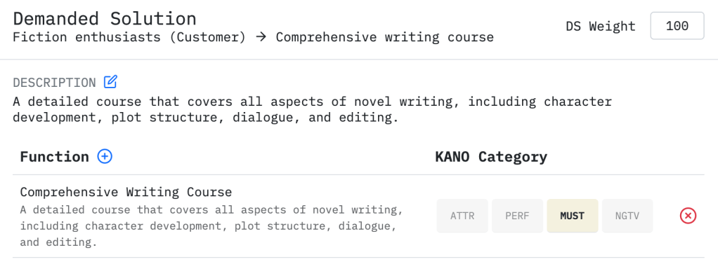 - Associated with your user profile are your demanded solutions. These become more important in other parts of the product, but here is an example of one for Now Novel: “Comprehensive writing course