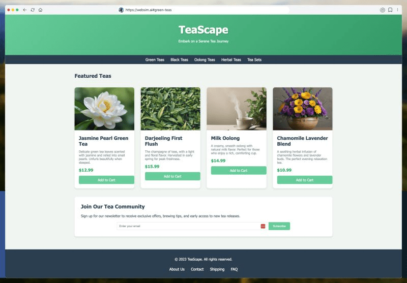 That’s the brief I gave websim.ai to see what website it would create. Websim creates websites that don’t exist on the fly. As a tea nerd I think it didn’t do too bad a job: